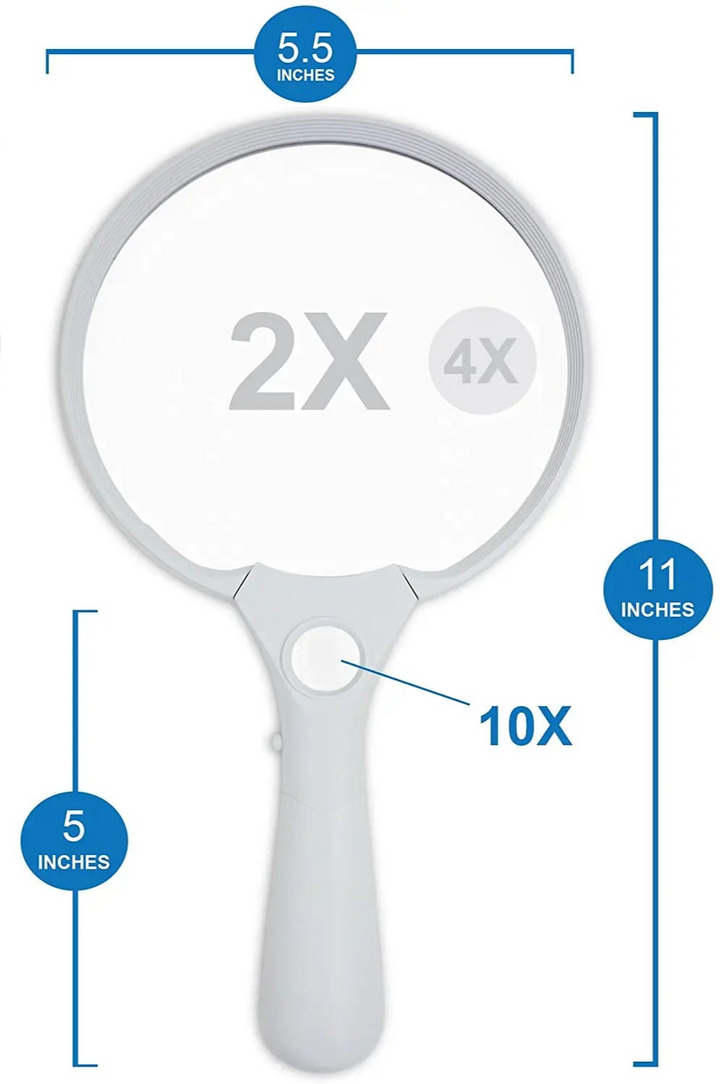 Découvrez la Loupe LED Extra Large à Main avec Lumière, idéale pour les personnes malvoyantes et les personnes âgées. Avec ses lentilles 2X, 4X et 10X, cette loupe lumineuse est parfaite pour lire des livres, des journaux, des cartes, et pour examiner des pièces de monnaie, des bijoux et des objets de collection.